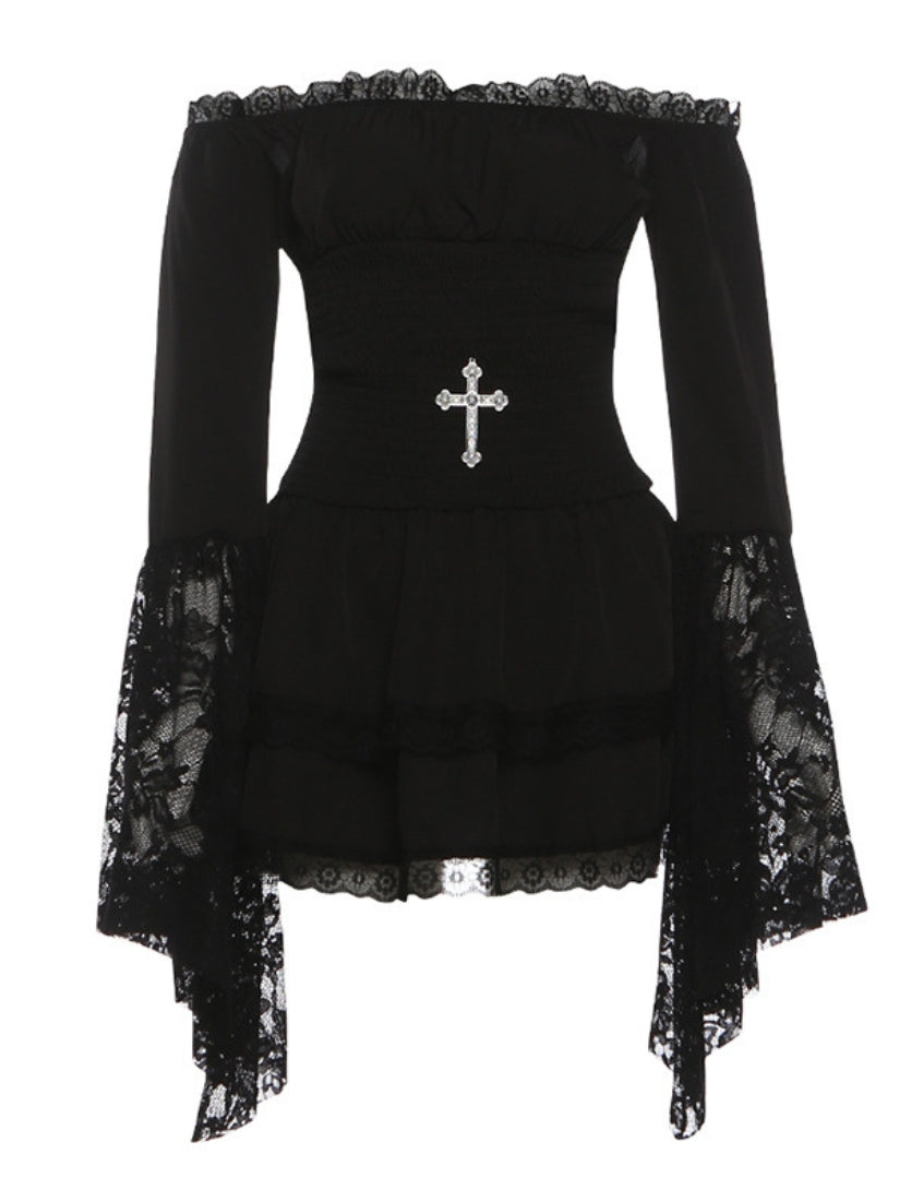 This gothic off-shoulder mini dress features elegant flared sleeves and a smocked bodice, beautifully accentuated with lace detailing. The mini dress is complemented by a striking cross embellishment at the waist, making it perfect for parties or special occasions. Embrace your feminine style with this unique piece!